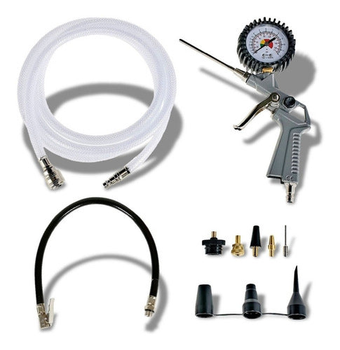 Incluye una práctica manguera trenzada de aire comprimido de alta calidad con una longitud de 2,5 metros, además de una pistola de soplado, un inflador de neumáticos y un set de adaptadores de ocho piezas.